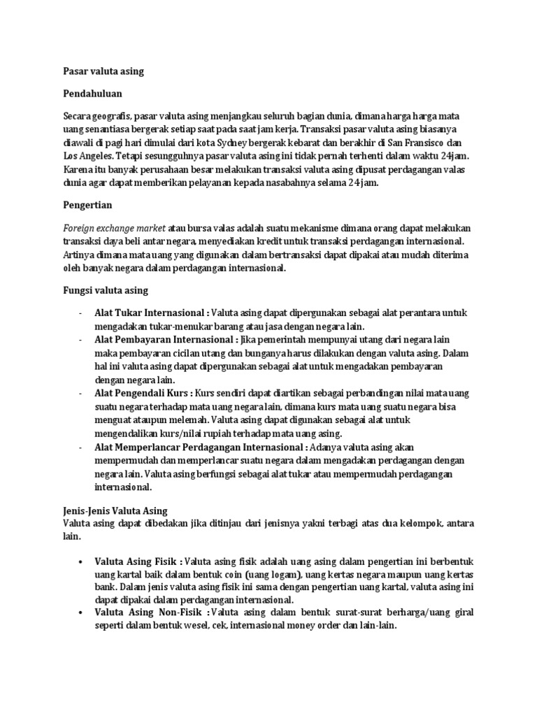 Definisi valas pada dasarnya istilah valuta asing atau valas. Devisa sendiri merupakan segala kekayaan suat negara yang berada di luar negeri yang dapat berwujud barang, jasa atau bahkan mata uang yang dapat digunakan sebagai alat. Perusahaan manajemen investasi adalah sebuah perusahaan yang mengelola sejumlah rekening atas nama nasabah. Valas merupakan mata uang yang diterima, dipakai, dan diakui untuk dijadikan alat pembayaran dalam perdagangan secara internasional. Jenis pasar modal ada banyak, salah satunya adalah pasar valuta asing. Pengertian valuta asing yang dimaksud dengan valuta asing adalah (foreign exchage) adalah mata uang negara lain (foreign currency) dari suatu prekonomian).misalnya, valuta asing bagi prekonomian indonesia adalah mata uang lain selain rupiah, misalnya yen jepang, ringgit malaysia, dan bath thailand. Sama seperti mata uang lainnya, valas juga memiliki nilai kurs yang resmi dan tercatat dalam bank sentral. Nilai tukar sering juga disebut valuta asing. Valas secara sederhana bisa didefinisikan sebagai mata uang yang digunakan sebagai alat pembayaran pada transaksi perdagangan internasional. Valuta asing fisik adalah uang asing di mana pengertian sebenarnya dari uang tersebut adalah uang yang berupa harta, harta tersebut dapat berupa logam, batas negara ataupun kertas bank yang dapat digunakan di dalam dunia transaksi atau jual beli internasional. Faktor pendorong dan hambatan perdagangan internasional) Pengertian valuta asing (valas) pengertian valuta asing (valas) adalah mata uang yang dapat digunakan atau dipakai dan mudah diterima oleh negara asing dalam perdagangan internasional. Valuta asing merupakan bagian dari devisa, devisa adalah segala kekayaan suatu negara di luar negeri yang berwujud barang/jasa atau mata uang asing yang dapat digunakan sebagai alat pembayaran luar negeri dan dapat diterima di dunia internasional.